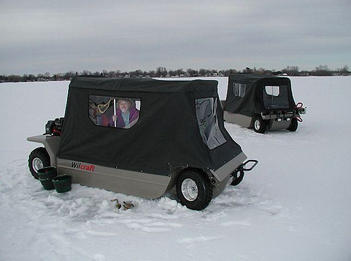 Это авто легко передвигается как по земле, так и по снегу и воде. Также в комплектацию входит и палатка.
