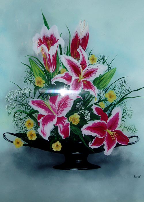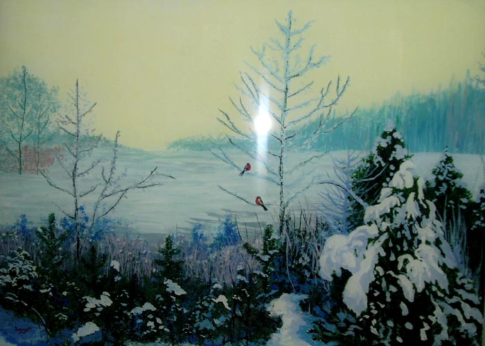 Работы выполнены акварелью с обратной стороны и закреплены эмалью. Сложность этих картин в том, что художник не видит что пишет, пишет по памяти наложения мазков. Ошибся - картину не исправить, приходится начинать заново. Если необходимо делать копию картины, то полного сходства добиться практически невозможно, картина будет по-своему индивидуальна.