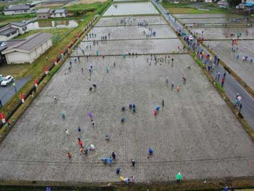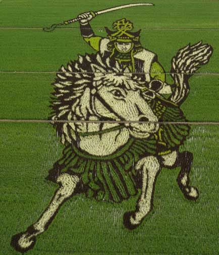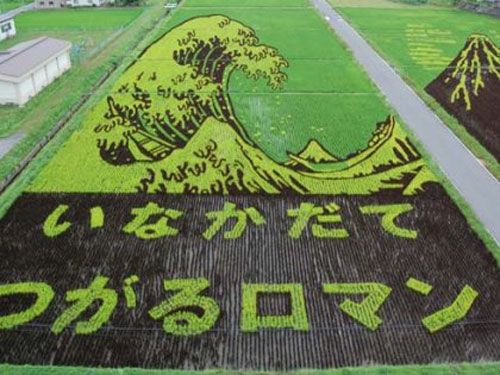 Японские фермеры изобрели новый вид искусства — гигантские картины из ростков риса на полях. В качестве «краски» используются разные сорта риса: обычный желтый рис издалека смотрится светло-зеленым, а бурый — практически черным. Первые результаты творчества фермеров видны уже через месяц — рис разных сортов прорастает, и на поле появляется задуманная картина.