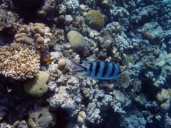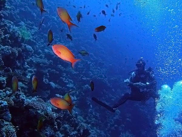 Кстати на такой глубине и живности-то не особо, да и зрение воспринимает все в другом цвете. К примеру, помидор красного цвета, под водой становится похожим по цвету на киви.