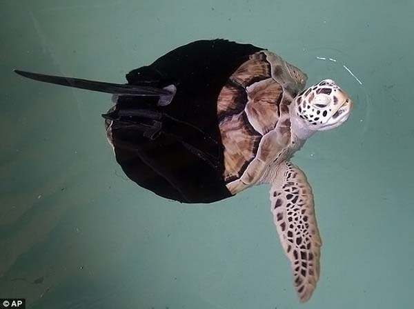 Во время нападения акулы черепашка потеряла три лапы. С одной лапкой у нее была возможность плавать только по кругу. Сегодня, когда черепашке исполнилось пять лет, ей соорудили протез который позволит плыть прямо несмотря на увечие.