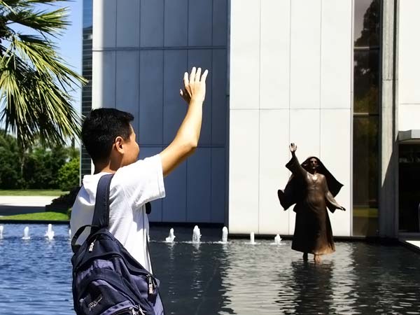 Вокруг собора расположены небольшие сады с мирно журчащими ручейками и несколькими скульптурами. Мне особенно запомнилась скульптура, изображающая Христа, предотвращающего побитие камнями грешницы. Вы, наверное, помните эти известные слова - "Кто из вас без греха, первый брось в нее камень". Для того чтобы как следует рассмотреть эту скульптуру, необходимо обойти вокруг, так как все время какая-то из фигур либо не видна вообще, либо повернута спиной. Такое перемещение делает зрителя как бы участником сцены. А разбросанные повсюду маленькие уютные лавочки так и притягивают просто посидеть и ничего не делать.