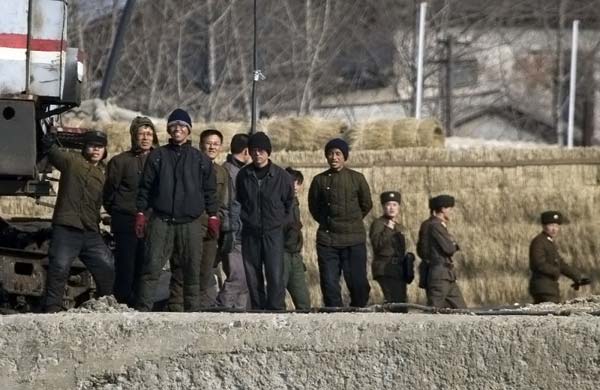 Жители Северной Кореи едут на грузовике мимо военного поста охраны на береге реки Ялу вблизи города Qingzhouli, Северная Корея. (Frederic J. BROWN/AFP/Getty Images)