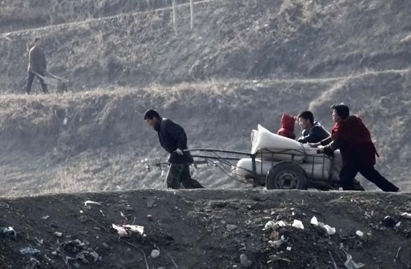 Люди тащат тележки в северокорейском городе Hyesan 4 апреля 2009. (REUTERS/Reinhard Krause)