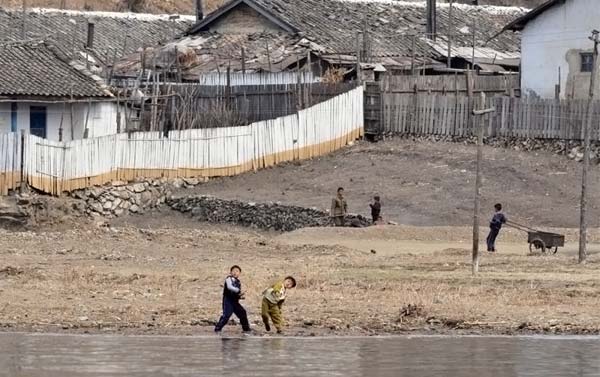 Северокорейские дети дерутся на берегу реки Ялу в воскресенье, 5 апреля 2009. (AP Photo/Ng Han Guan)