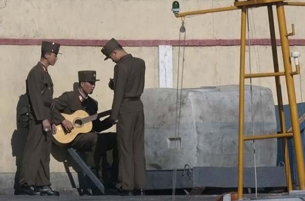 Северокорейский солдат играет на гитаре на берегах реки Ялу вблизи города Синычжу, напротив китайского города Дандон по 15 апреля 2009. (REUTERS/Stringer)