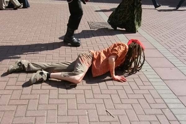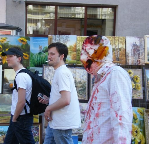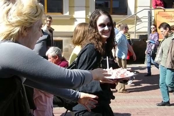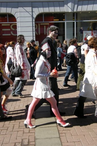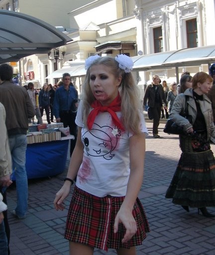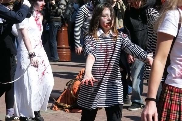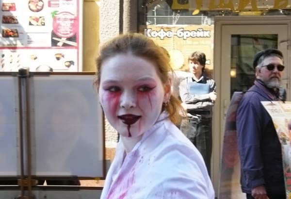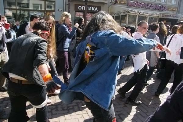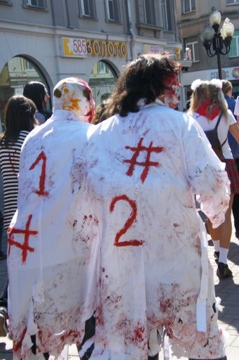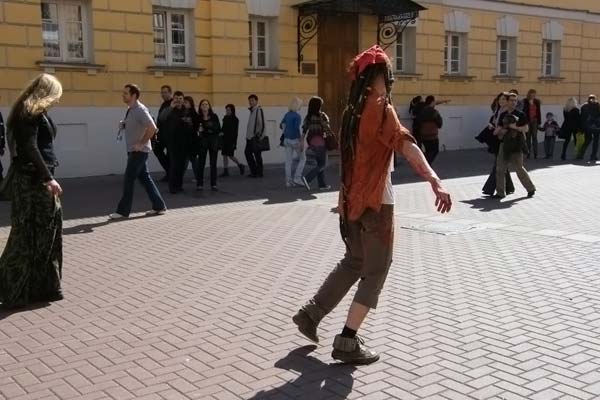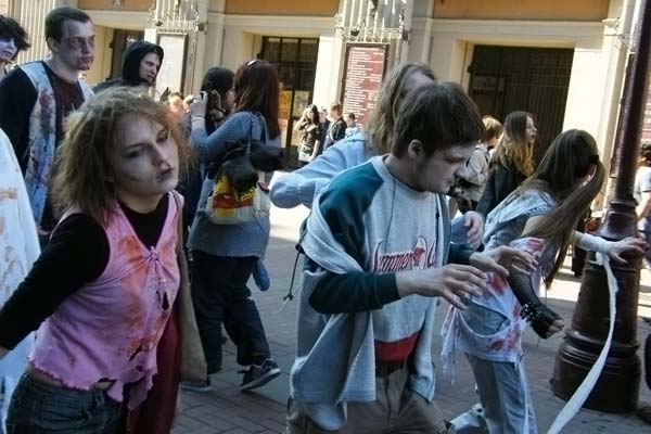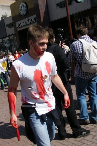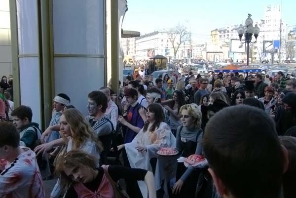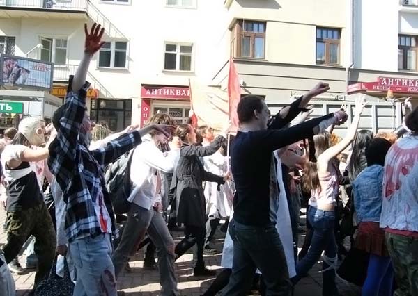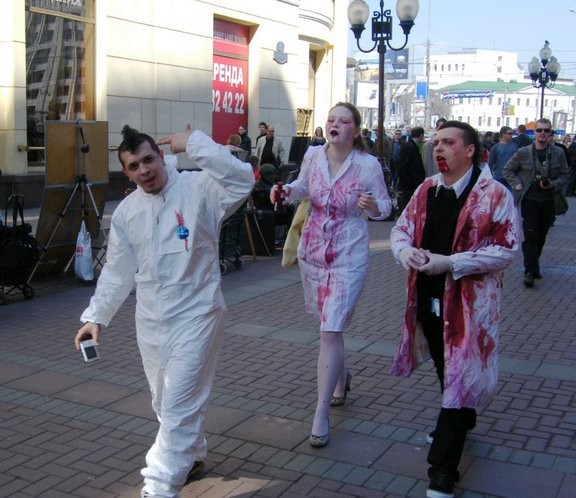 В воскресенье, 26 апреля в 14 часов, старый Арбат внезапно наполнился зомби. Реакция обывателей была разная. Азиатские туристы радостно фотографировали. И вообще, зомби то были мирные, но вот фотографы просто таки атаковали зомбей. Самое забавное получилось в конце, когда толпа зомби дошла до конца Арбата и стала требовать мяса у входа в Макдональдс.