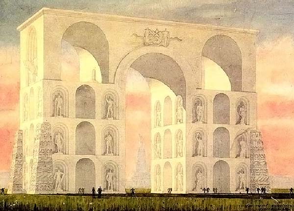 "Арка героев". Монумент героическим защитникам Москвы. (Л. Павлов. 1942) Что удивительно, газета «Литература и искусство» в самый разгар войны сообщила о том, что заканчивается конкурс на монументы героям Великой отечественной войны. Возможно, сооружение монумента планировалось после завершения войны. Кстати, автор проекта арки предложил воплотить своё творение прямо на Красной площади. Сзади виднеется Дворец Советов, о нём позднее.