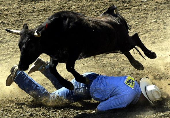 28) Участник калифорнийского родео не смог удержаться верхом на быке, 19 июля, Калифорния. (AP Photo/Monterey County Herald/Orville Myers)