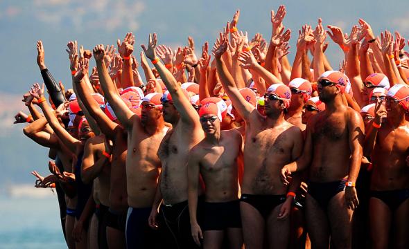 2) Пловцы машут, стоя на азиатском берегу Стамбула, перед стартом ежегодного международного заплыва из Азии в Европу, 19 июля. Спортсменам необходимо преодолеть дистанцию в 6 км. вдоль пролива Босфор с азиатского берега Стамбула до европейского. (MUSTAFA OZER/AFP/Getty Images)