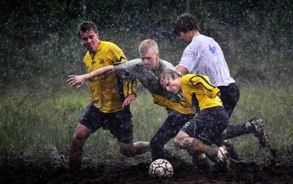 22) По колени утопающие в грязи игроки, во время Чемпионата Мира по болотному футболу в Хюрюнсалми, Финляндия, 17 июля. Естественное болото было разделено на 22 игровых поля для 325 команд. В общей сложности в чемпионате принимало участие 5200 игроков из Финляндии, Норвегии, России, Франции и Голландии. (REUTERS/Vesa Moilanen/Lehtikuva Finland)