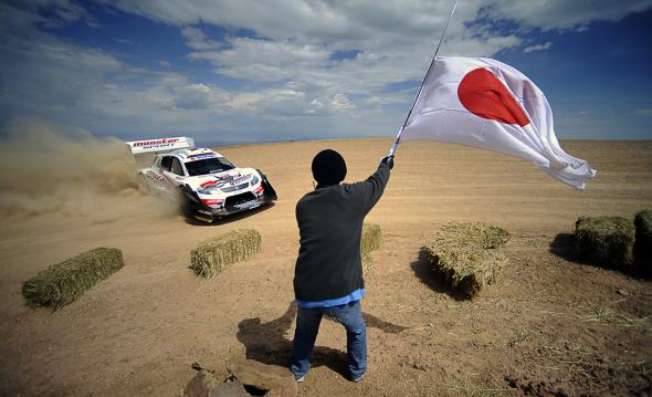 25) Джейсон Вонг приветствует экипаж Нобухиро Таджимо, размахивая японским флагом, во время авто гонки Pikes Peak International Hill Climb на склонах горы Pikes в Колорадо, 19 июля. (AP Photo/The Gazette/Bryan Oller)