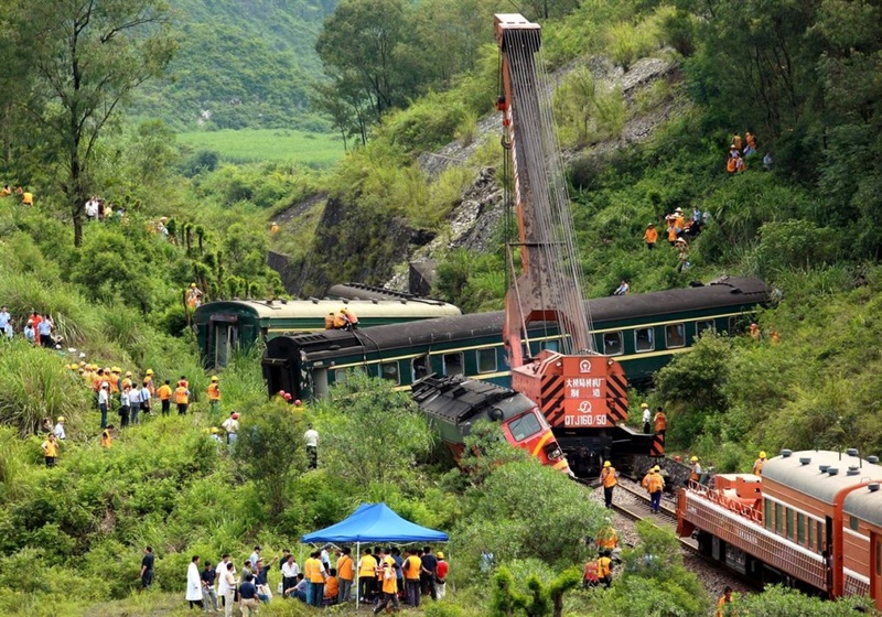 Рабочие убирают поезд, сошедший с рельс, неподалеку от населенного пункта Лиючен в юго-западном автономном районе Китая Гуанси 29 июля. Как сообщают китайские сообщают СМИ, в результате инцидента погибли 4 пассажира и более 50 получили ранения.