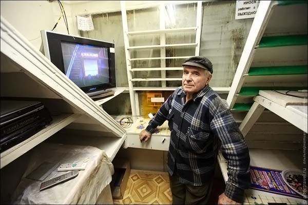 А вот и сам Леонид, мы находимся внутри торгового киоска, в который можно попасть из-под земли. На телевизоре видно изображение с видеокамеры напротив входа, все под контролем.