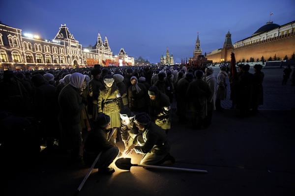 Люди в форме времен Великой Отечественной войны ждут на Красной площади в Москве начала репетиции парада в ознаменование 68-й годовщины парада, с которого военные отправились на фронт.