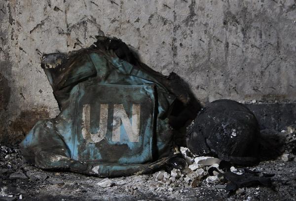 Сгоревший бронежилет и шлем ООН видны в разрушенном пансионе в Кабуле, в котором после нападения талибов погибли пять сотрудников ООН в четверг.