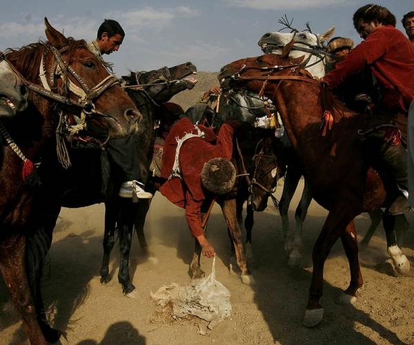 Афганцы в Кабуле играют в старинную игру бузкаши, что в дословном переводе означает «схватить козла». Спотривным снарядом в такой игре выступает обезглавленная туша козла.
