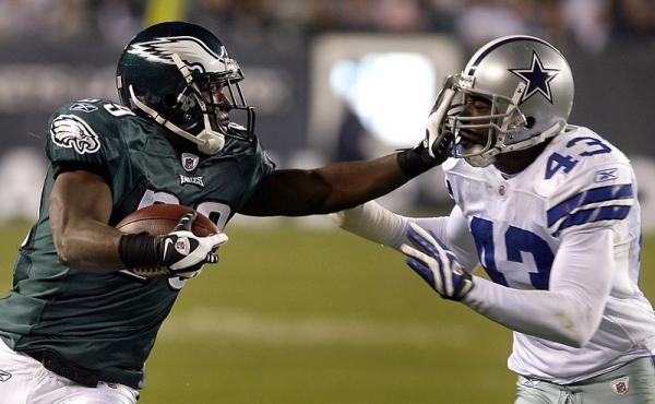 29-летний игрок команды «Philadelphia Eagles» ЛеШон МакМой отталкивает игрока «Dallas Cowboys» 43-летнего Джеральда Сенсбау во второй игры NFL в Филадельфии. Даллас победили Филадельфию со счетом 20-16.