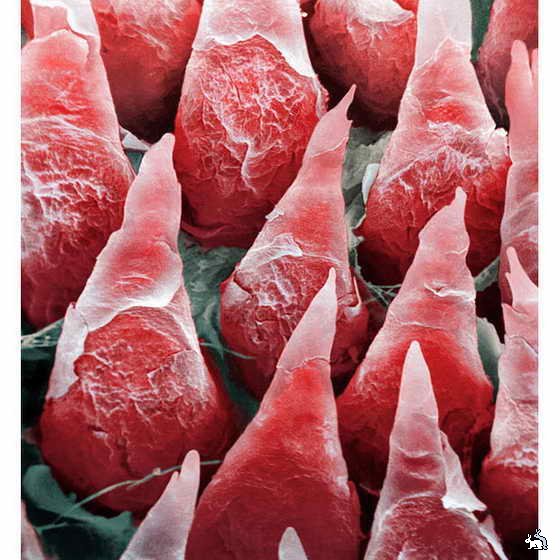 Поверхность человеческого языка под микроскопом. Язык покрыт многочисленными нитевидными сосочками, которые ощущают давление.