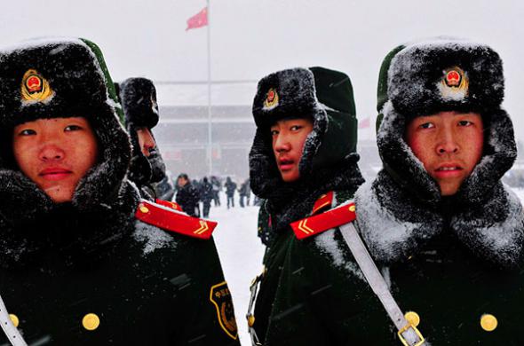 Китайский страж порядка мужесвенно переносит снегопад. ChinaFotoPress / Getty Images