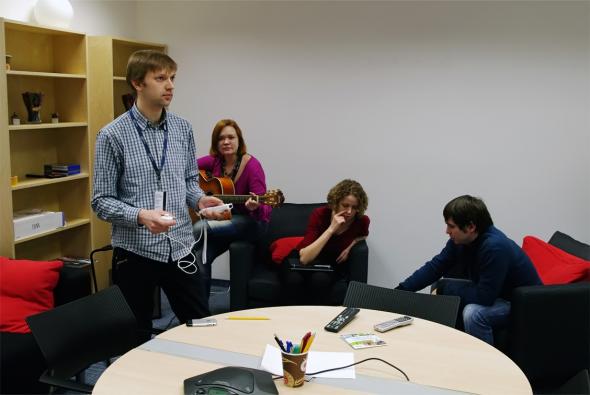 Коллектив состоит из неравных процентных соотношений М (70%) и Ж (30%), все молодые и полны сил ) Особо устающие иногда собираются в небольшой комнате отдыха, где борют друг друга интеллектом (в шахматы), смотрят фильмы ) или играют на гитаре, в Wii или в теннис.