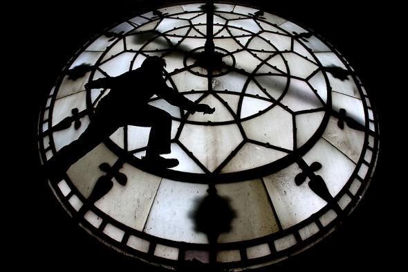 Часовщик Кейт Скоби-Янгс настраивает часы “Great Abel” на здании мэрии в Манчестере. На часах есть надпись «Научите нас считать свои дни». (Dave Thompson/PA/Associated Press)