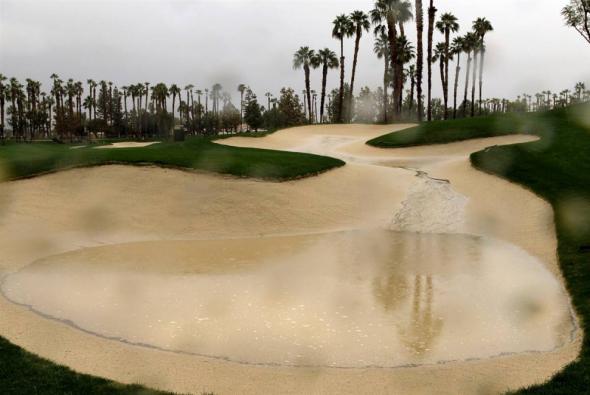 Лужа в песочнице на частном гольф-клубе в «PGA West» в Ла Квинта (Калифорния). Турнир по гольфу «Bob Hope Classic» пришлось отложить из-за штормов, накрывших южную Калифорнию. (Stephen Dunn / )
