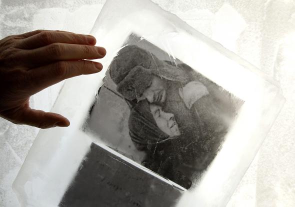Посетитель прикасается к старой фотографии в кубике льда на выставке в Санкт-Петербурге. Выставка посвящена годовщине окончания блокады Ленинграда во время Второй мировой. (Alexander Demianchuk/)