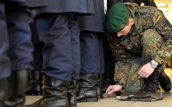 Солдат чистит сапоги другого солдата перед прибытием израильского президента Шимона Переса в аэропорту Берлина. Во время своего официального визита Перес обратился к немецкому парламенту. (Michael Gottschalk/Agence France-Presse)
