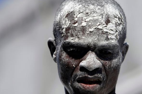 Лицо рабочего в муке во время разгрузки мешков с едой в Порт-о-Пренсе. Международная помощь, поступающая в Гаити после землетрясения 12 января, столкнулась с многочисленными проблемами, и многие люди все еще нуждаются в воде и еде. (/Francois Mori)