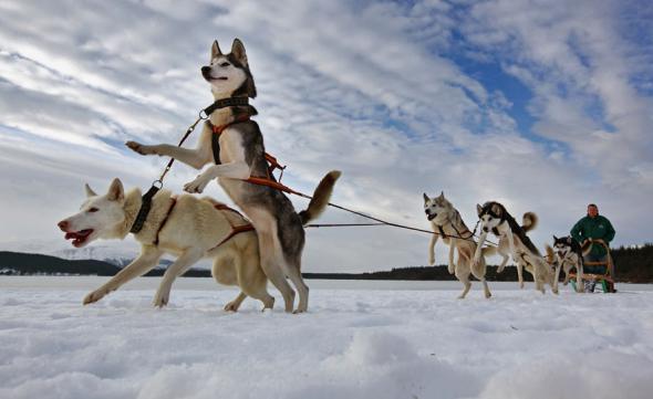 Пит Джонс и его упряжка готовятся к 27-ому ежегодному «собачьему ралли» на санях у озера Лох-Морлих (Шотландия). Более 1000 собак примут участие в крупнейшем забеге собак хаски в этом году. (Photo by Jeff J Mitchell)