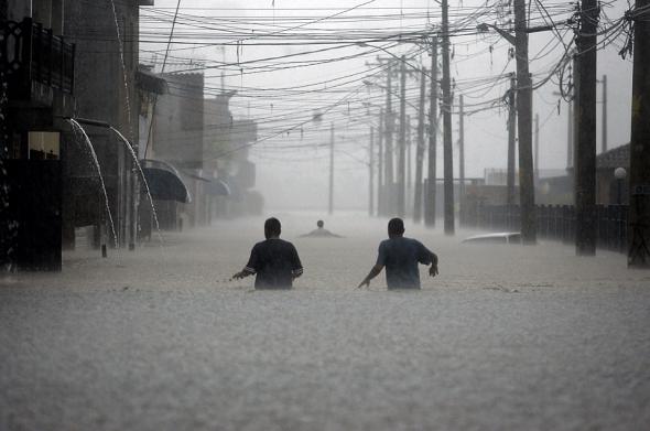 Люди идут по затопленной улице в Сан-Паулу (Бразилия). С 1 января более 100 человек погибло в результате оползней и наводнений, вызванных постоянными ливнями в Бразилии. (Nelson Antoine/Associated Press)