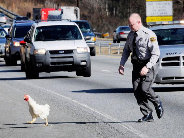 Патрульный Северной Каролины пытается поймать курицу, чтобы убрать ее с шоссе №85, недалеко от Лексингтона (штат Северная Каролина). (/The Dispatch, Donnie Roberts)
