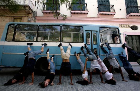 Группа кубинских танцоров «Данза Эспирал» выступает рядом с автобусом на Международном фестивале танца в старом районе Гаваны. Колониальные площади и здания старой Гаваны являются задним фоном для танцоров, мимов и музыкантов со всего света, которые принимают участие в ежегодном танцевальном фестивале. (AP Photo/ Franklin Reyes)