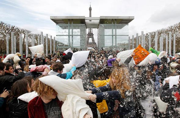 В первую субботу апреля в мире проходит Международный день битвы подушками. Событие это проводится в десятках городов по всему миру на главных площадях. В воздухе летали пух и перья, люди не только приходили со своими подушками всех цветов и размеров, но и разрисовывали себя, так сказать, «по-боевому».Обычно битва длится не более нескольких минут. К примеру, битва у основания Эйфелевой башни закончилась через 15 минут. (Benoit Tessier / Reuters)