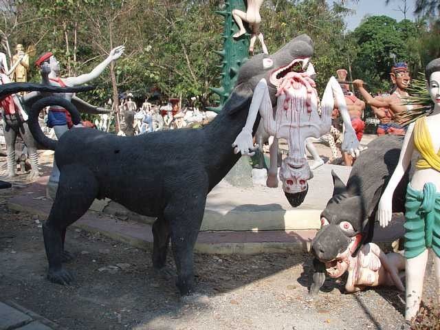 Это необычный парк, скорее даже странный и жестокий. Называется он Wat Phai Rong Wua в провинции Suphanburi, здесь посетителям предлагают посмотреть на необычные скульптуры, зрелище не для слабонервных.