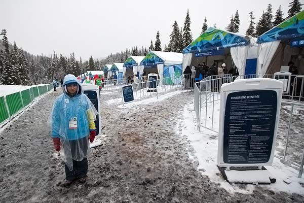 Надо быть, наверное, настоящим болельщиком и любителем лыжного спорта, чтобы уехать из Ванкувера за сто двадцать километров и под проливным дождем со снегом стоять два часа, ожидая результатов эстафеты биатлонистов 4х7,5 км. Что видит зритель на лыжном стадионе в Уистлере? Практически ничего. А в такой снегопад, который случился сегодня — вообще ничего. Поэтому, рядом установлен огромный телеэкран, на котором транслируют картинку из телевизора, а на табло показывают результаты этапов. Можно кричать, бить в колокольчики, размахивать флагами. Развлекать себя, одним словом. Огневой рубеж, лыжню видно очень схематически, но никто, похоже, не расстраивается — болеют не хуже, чем на футболе, бегают с горки для зрителей к забору, ограждающему дистанцию и назад, кричат, шумят. Здорово, мне очень понравилось.