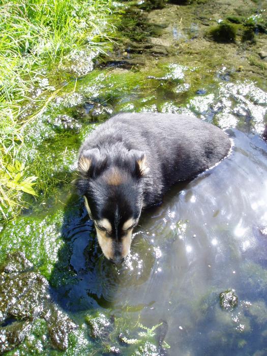 Вода не то что горячая, градусов 50. Надо будет сходить зимой что бы почувствовать контраст. Собака полезла первой в какую то заводь.