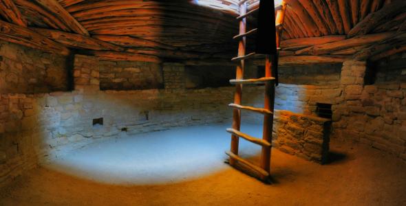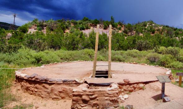 Потом Кива. Сооружение для духовных практик. В ней индейцы проводят инициации. Можно сказать проводили, так как большинство Pueblo индейцев приняли католичество, и монахи разрушили почти все.