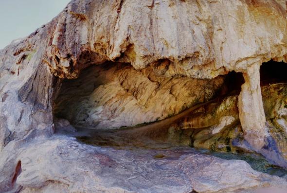 Сама порода мягкая, даже далеко от реки вся пропитана водой. Кое где вымыло (размыло) небольшие пещеры, и с потолка капает.